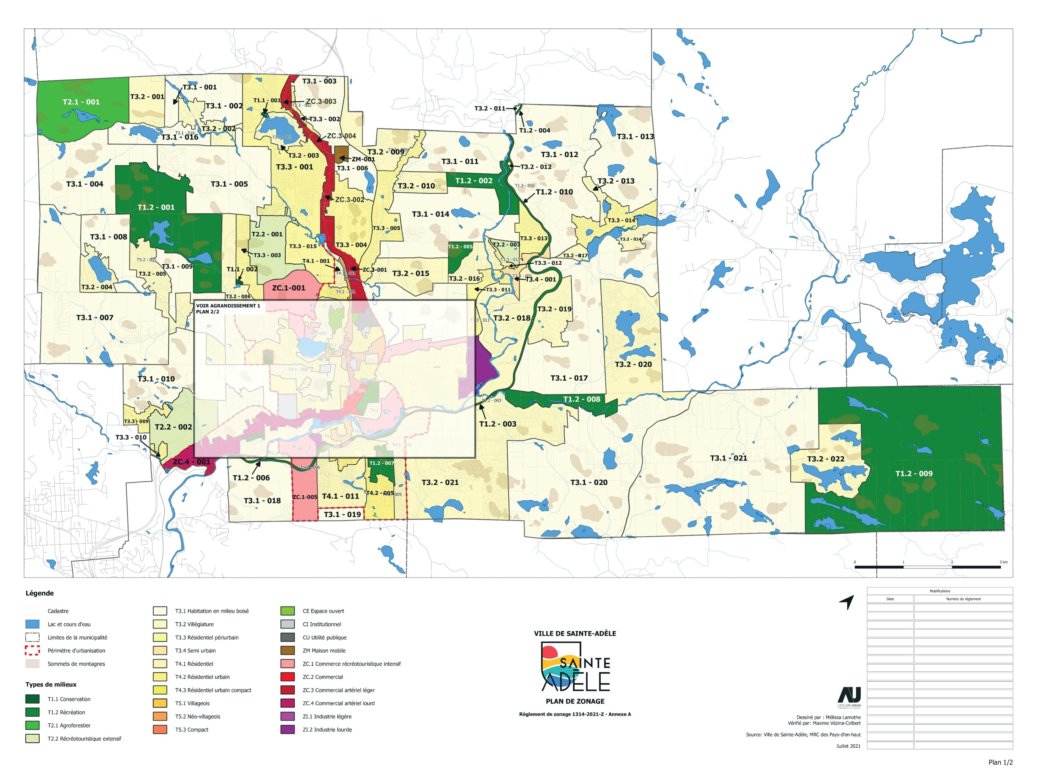 Idéalement, à défaut d’une carte interactive, votre ville ou MRC publie la géomatique du plan de zonage sur Données Québec (voici celle de Repentigny par exemple) mais généralement ce n’est pas le cas. Par contre, les villes publient presque toujours une carte de zonage sur leur sites web, la plupart du temps en format PDF, plus souvent dans la section des règlements d’urbanisme. On la trouve sous le rubrique Règlements - Urbanisme à Sainte-Adèle, sur la page Règlementation et Permis à Morin-Heights, et sur la page générale de réglementation municipale à Saint-Calixte.