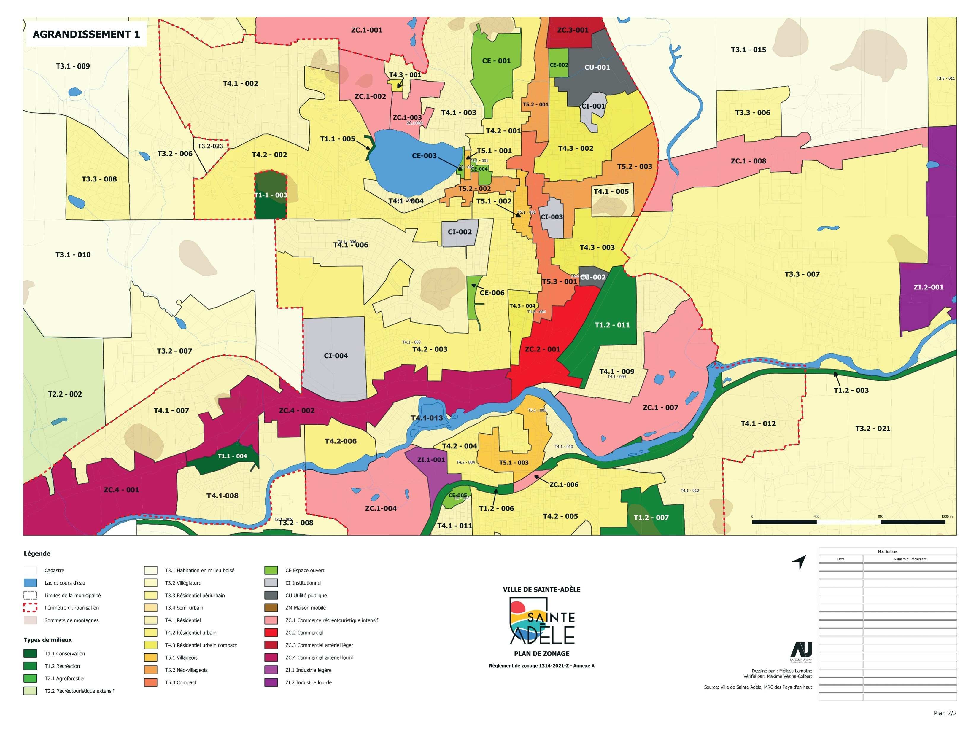 Sainte-Adèle figure malheureusement parmi ces villes moins douées en géomatique. Qui plus est, elle publie aussi deux cartes séparées de zonage, une pour la ville au complet et une autre plus détaillée pour le périmètre urbain. Mais tout n’est pas perdu! QGIS est très capable de faire quelque chose avec ce genre de PDF, avec un peu plus de travail.